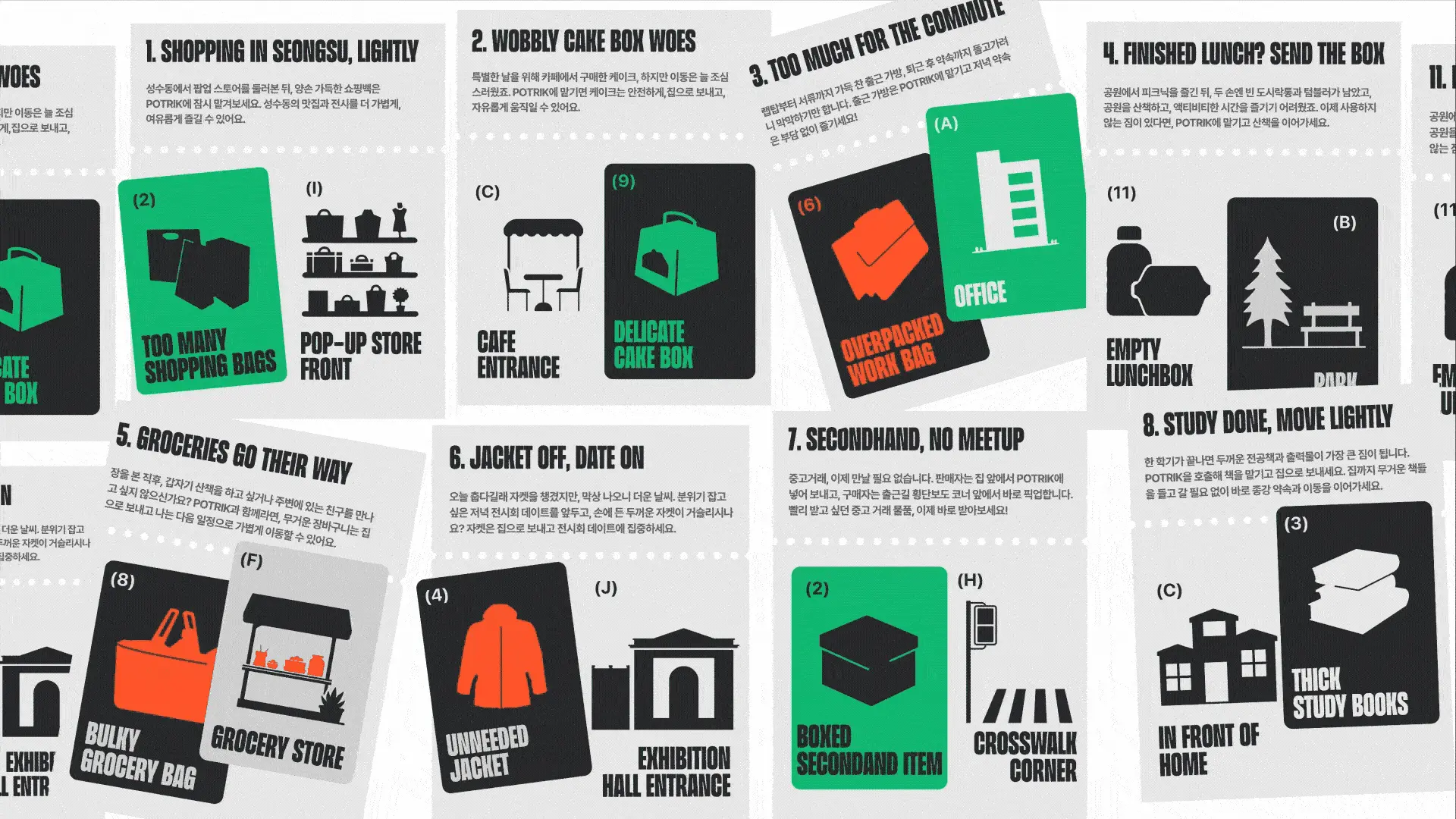 더 이상 짐 때문에 동선을 바꾸거나, 보관함을 찾아 발걸음을 멈출 필요도, 물건을 주고받기 위해 시간을 내어 이동할 필요도 없습니다. POTRIK은 순간에 맞춰 짐을 보내고 받는 새로운 딜리버리 시스템을 제안합니다. 양손은 가볍게, 이동은 끊김 없이. 우리가 꿈꾸던 자유로운 이동을 말이죠.